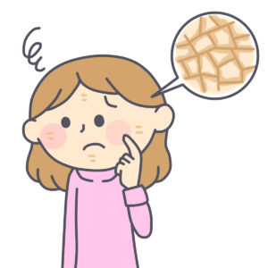 - 角質層がめくれ上がり、白い粉のように見えたり、 薄い皮が剥がれたりします。