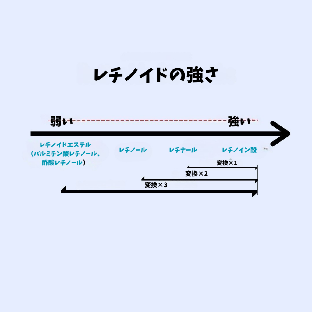 肌の中では、最終的に「レチノイン酸」という活性型に変換されて効果を発揮します。 この変換ステップが多いほど作用はマイルド(守り)になります。 逆に、変換ステップが少ないほど作用は強力(攻め)になる仕組みです。