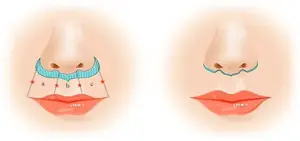 - 人中短縮手術によって鼻の下の皮膚が引っ張られ、鼻の穴が広がって見えることがあります。