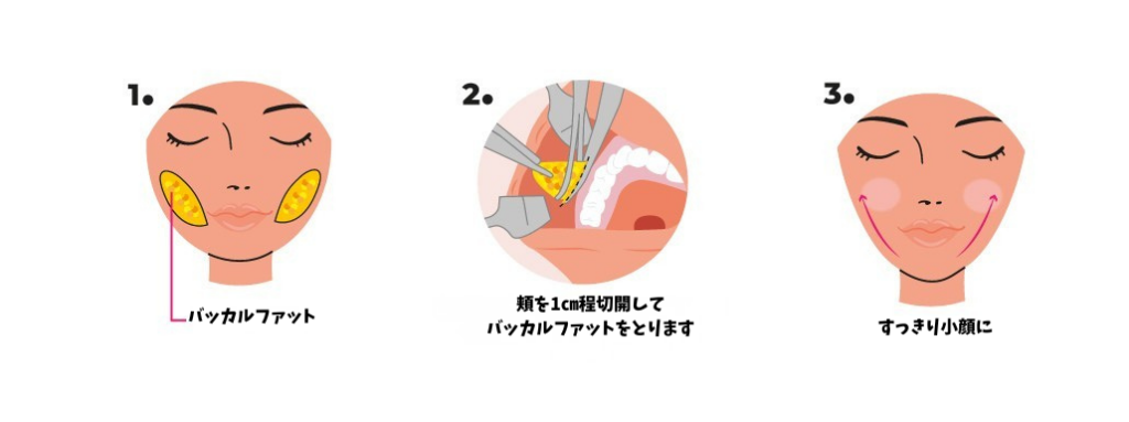 | バッカルファット | ・頬の奥深くにある脂肪の塊 ・笑った時に頬がぽっこりと盛り上がる ・ダイエットではほとんど減らすことができない | 口の中から頬を触ったときに、弾力のある塊として感じられるか |