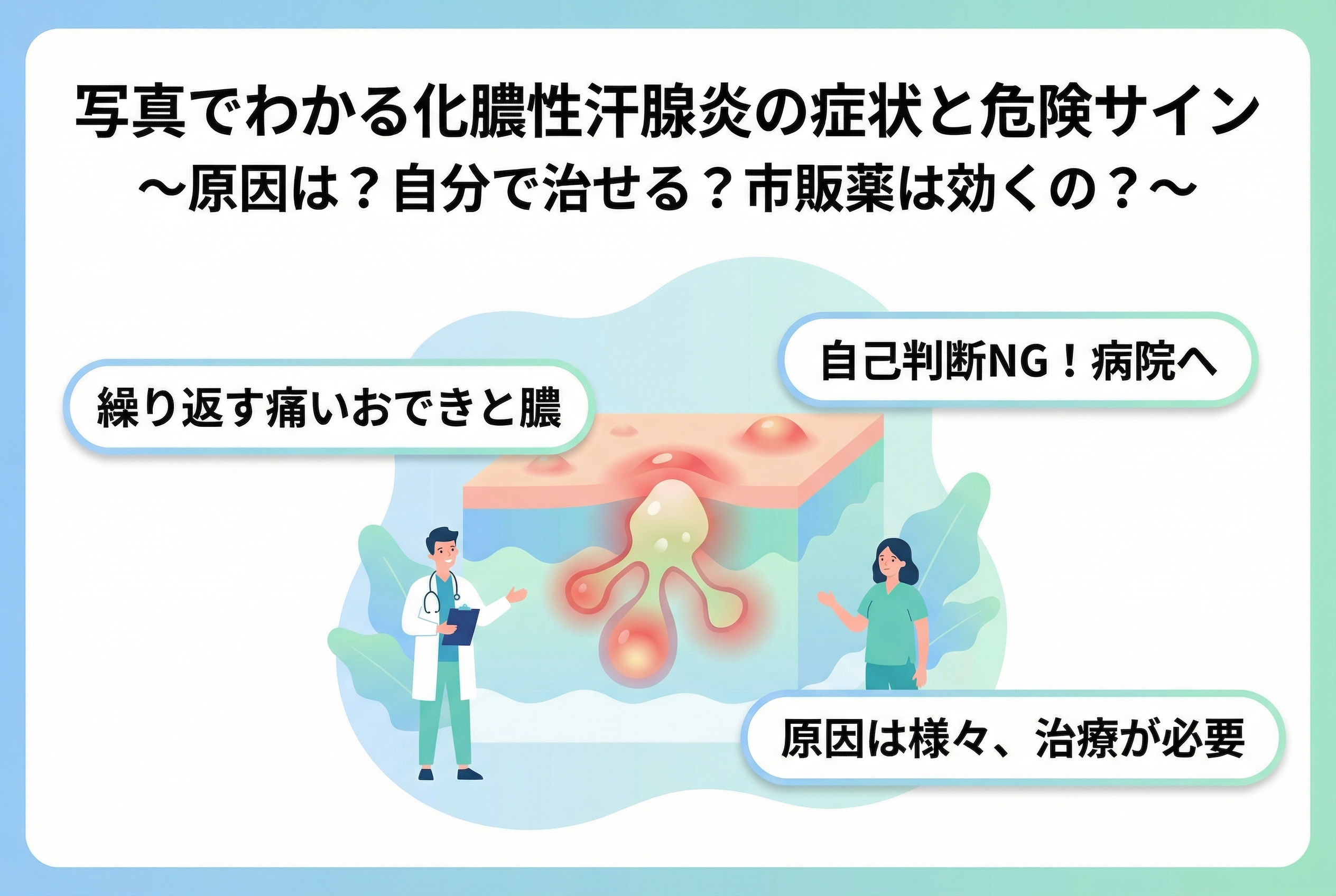 - 化膿性汗腺炎は慢性的に繰り返し、複数箇所にできる傾向があります。