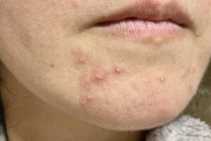 - 主に皮脂腺の炎症によって引き起こされ、面皰(めんぽう、いわゆる白ニキビ・黒ニキビ)、赤いブツブツ、膿を持ったものが現れます。