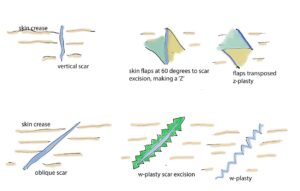 - 傷跡の方向を顔のしわの方向に合わせたり、皮膚の緊張を分散させたりすることで、目立たなくする方法です。
