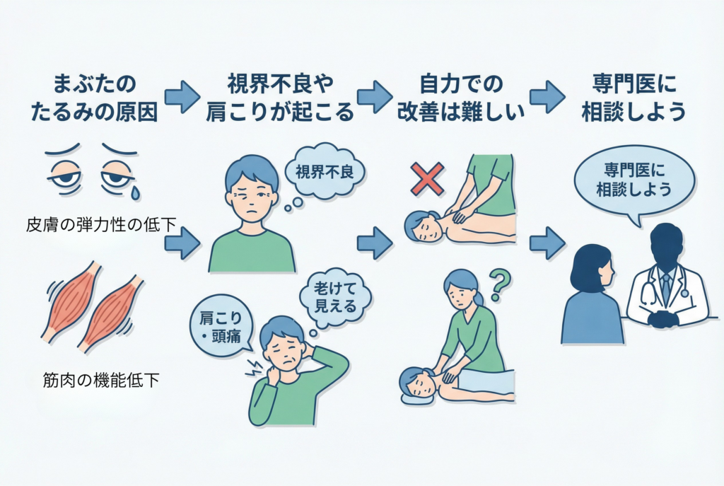 鏡を見るたびに、まぶたのたるみが気になり「老けて見える」と感じていませんか?実は、こうしたお悩みで形成外科を受診される方は少なくありません。まぶたのたるみは、単に見た目の問題だけでなく、視界不良や肩こり、頭痛、眼精疲労といった機能的な不調を引き起こすこともあります。しかし、残念ながら自力でのマッサージやアイケアだけでは根本的な改善は難しく、かえって負担をかける可能性も。