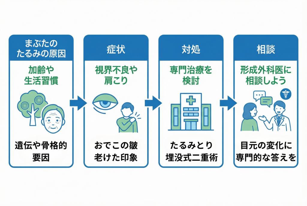 まぶたのたるみは、多くの人が経験する自然な変化です。しかし、その背後には皮膚の弾力性の低下、まぶたを支える筋肉や腱のゆるみ、まぶた周りの脂肪の変化といった複雑なメカニズムが隠されています。