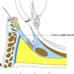 - 下まぶたを眼球に引きつけて、まぶたの形を内側から支えているのが「下眼瞼牽引筋(lowerlid retractors)」です。