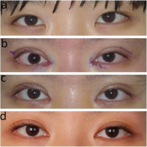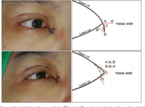 - 下まぶたの縁に沿って切開し、小さな三角皮弁を組み合わせることで、異所性の内眼角靭帯を切除し、内眼角を上方へ再配置する新しい方法も報告されています。これにより小さな瘢痕で自然な二重まぶたのラインが実現され、内眼角の自然な形状を保持しつつ眼瞼裂(目の開口部)を広げることが可能です。