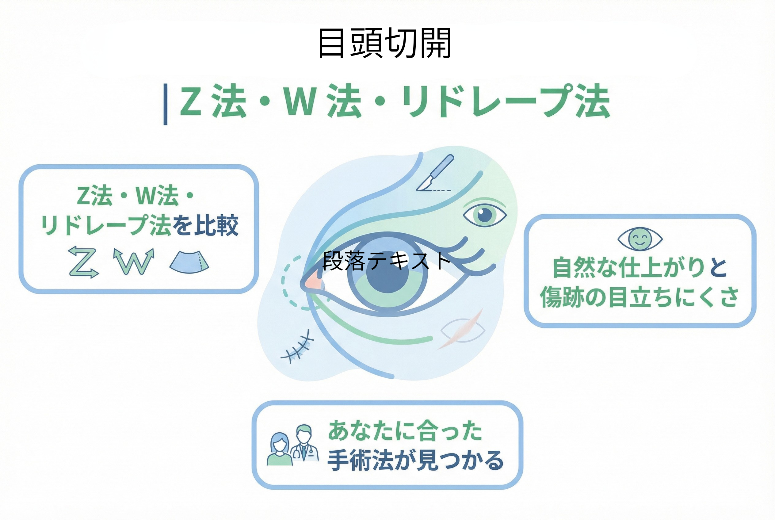 形成外科専門医、美容外科専門医(JSAPS)として、私たちは患者様の理想の目元を実現するため、一人ひとりの目の状態に合わせた最適な術式を提案しています。ここでは、主な目頭切開の術式であるZ法、W法、そしてリドレープ法について、それぞれの特徴と期待できる目の変化を詳しく解説します。
