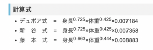 身長と体重で計算する代表的な計算式(Du Bois式・藤本式・Mosteller式)
