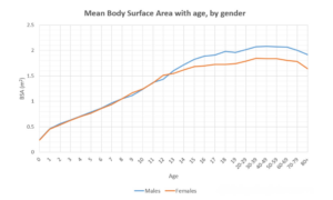 そこで、より個人の代謝能力を正確に反映する指標として「体表面積」が用いられます。