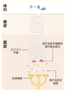 具体的なメカニズムはまだ完全に解明されているわけではありませんが、病態生理は不明な点が多いものの、交感神経の過活動が重要な役割を担っていると多くの研究で指摘されています。過活動状態の交感神経が、手のひらのエクリン汗腺に過剰な刺激を与えていることが原因とされています。エクリン汗腺は、ほぼ全身に分布しており、特に手のひらや足の裏、わきの下に多く存在します。