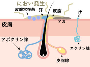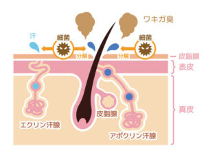 - 汗として分泌されたアポクリン汗腺の成分は、わきの下にいる皮膚常在菌によって分解されます。