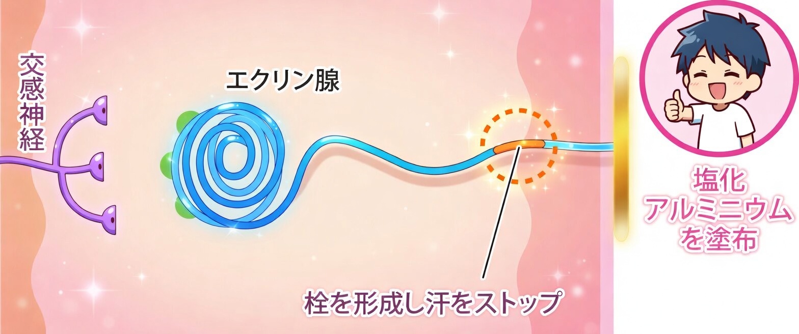 - 汗腺の出口を物理的に塞ぎ、発汗を抑える効果が期待できます。
