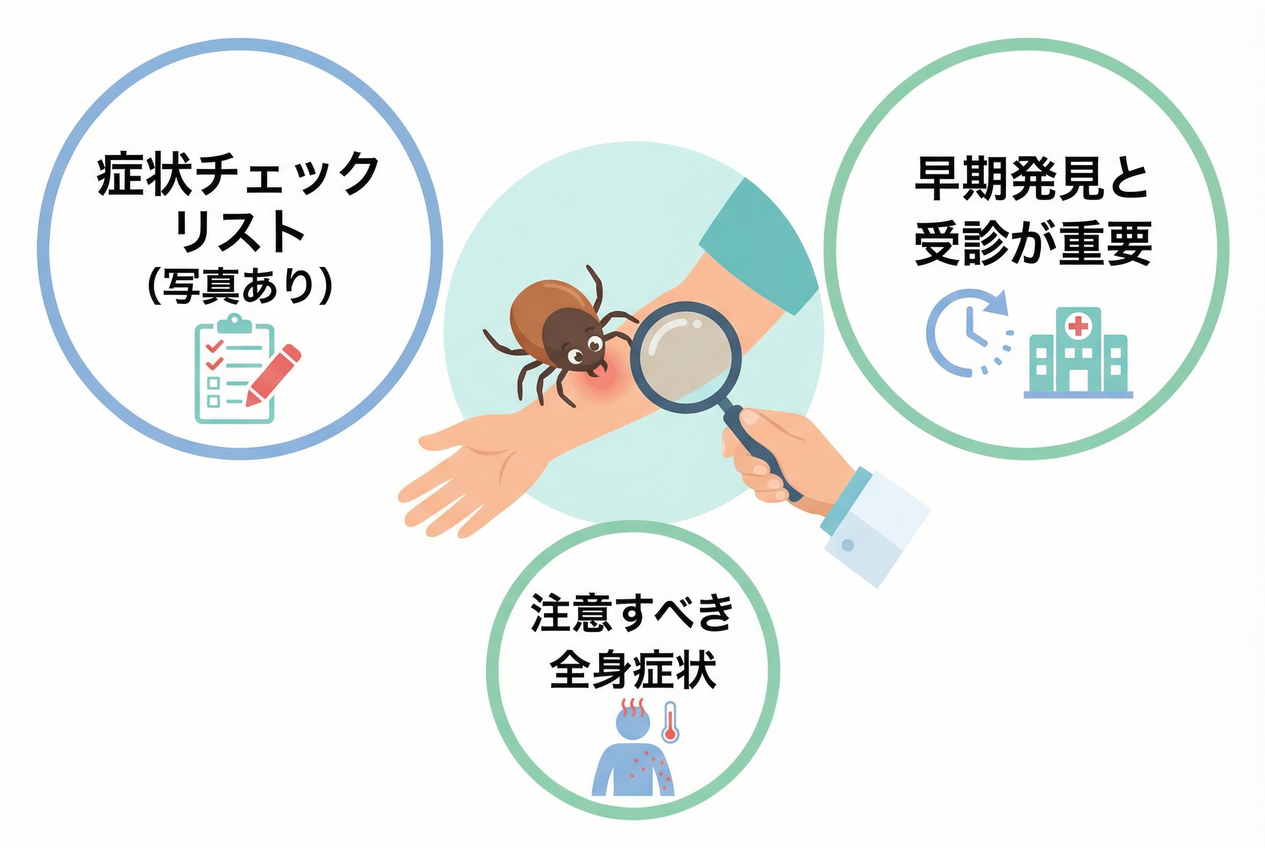 - 重症熱性血小板減少症候群(SFTS)やライム病などの、マダニが媒介する感染症の可能性を疑う必要があります。