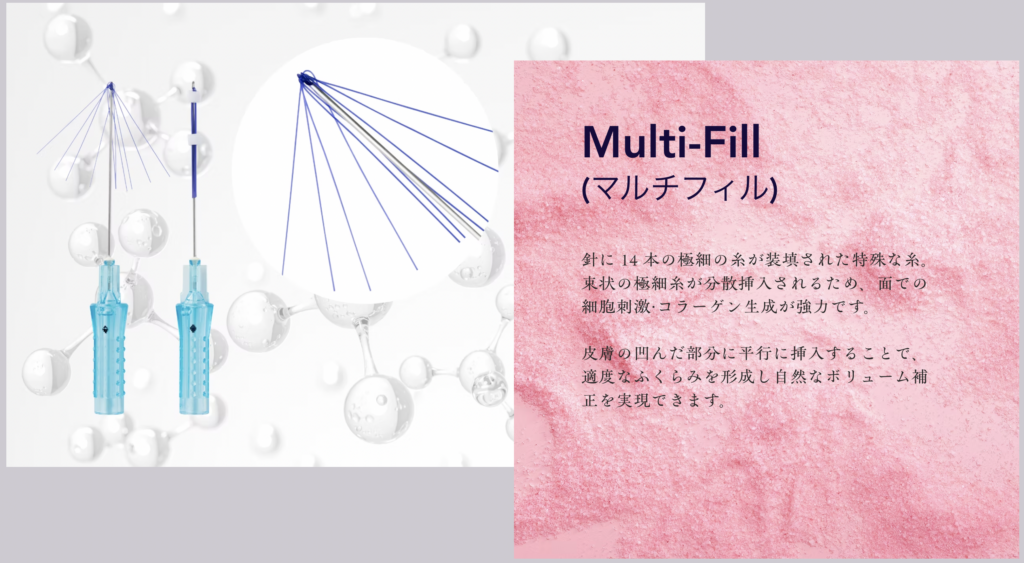 そして、「マルチフィル」は、1つの針に14本の極細の糸が装塡されたもので、束状に極細糸が挿入されることで、凹みを持ち上げることができます。最適な種類の本数を用いることで、より自然で立体的な仕上がりを実現します。くまりんとぽにょりんを組み合わせることで、単一の製剤や技術では難しかった、きめ細やかなエイジングケアが可能になります。