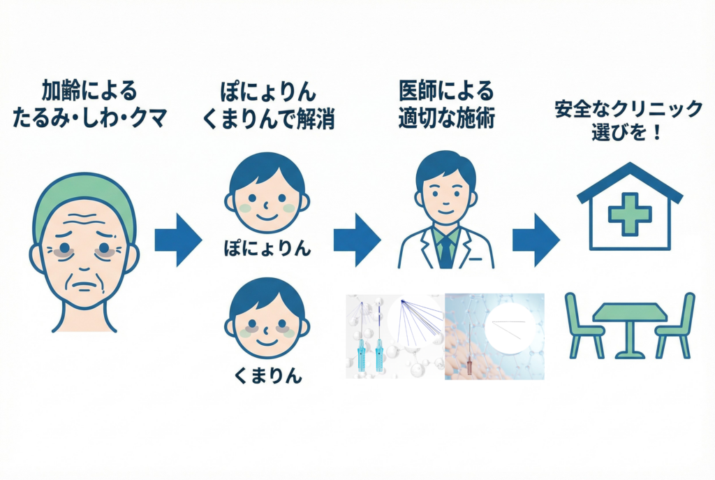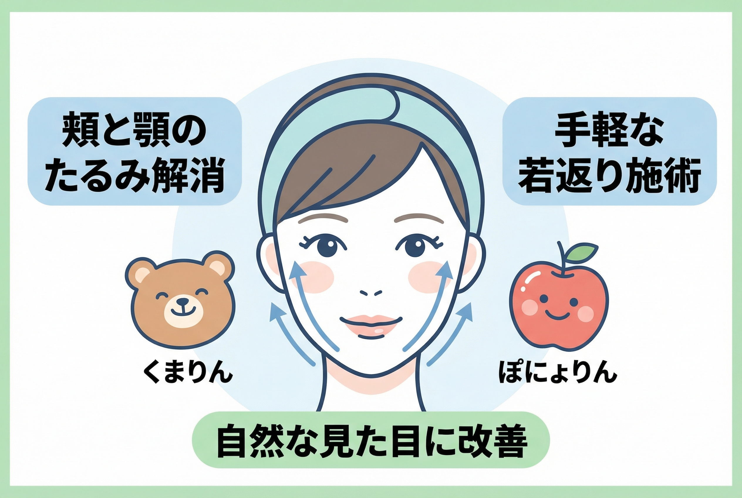 40代以降、お顔の変化に悩みを抱える方は少なくありません。たるみやしわ、目の下のクマなど、気になる症状を改善したいと願う一方で、どのような施術がご自身に合っているのか迷われることも多いでしょう。美容医療には多様な選択肢があり、それぞれ特徴が異なります。ここでは、形成外科専門医・美容外科専門医(JSAPS)監修のもと、ぽにょりん くまりんが代表的な若返り施術であるヒアルロン酸、ボトックス、糸リフトとどのように違うのか、そして最適な選択のために知っておきたいポイントについて詳しく解説いたします。