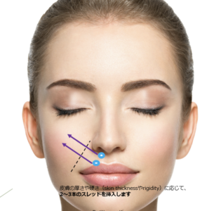 - 吸収性の糸を皮下に挿入し、目の下の凹みやほうれい線やマリオネットラインなどの段差によるしわを治します。