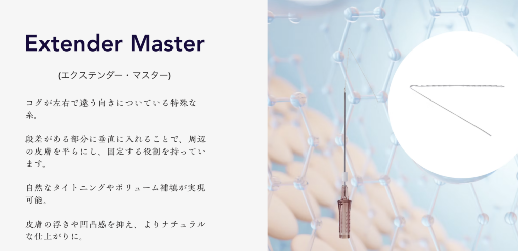 「エクステンダーマスター」は、従来の糸リフトより短い糸でその間にコグが逆向きについています。これを段差がある部分に入れて伸ばすことで、周辺の皮膚を平らしに、固定することができます。お一人おひとりの皮膚の状態に合わせたオーダーメイドの治療戦略を立てることで、最適な結果を目指します。