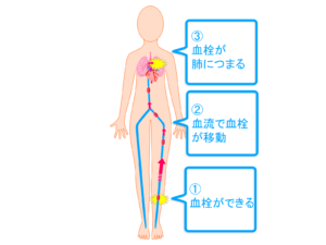 これは、静脈にできた血栓が血流に乗って肺の血管に詰まってしまう、命に関わることもある非常に危険な状態です。