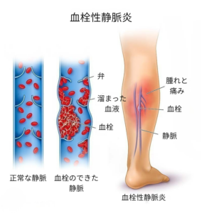 血栓性静脈炎は、静脈の中にできた血栓(血の塊)が原因で炎症が起きる病気です。