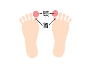 | 頭痛 | 両足の親指の腹全体です。特に指の先端は「頭頂部」、腹の中心は脳の指令を出す「脳下垂体」に対応します。 |