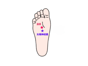 - 腎臓:足裏のほぼ中央、指を曲げた時にくぼむ部分。「湧泉(ゆうせん)」という万能のつぼでもあります。