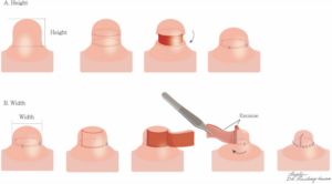 3. 高さ・直径を同時に小さくする方法 より精密なデザインが求められる場合、高さの調整と直径の調整を組み合わせた手術が行われます。例えば、韓国の研究グループが報告した方法では、257名の患者さんがこの複合的な手術を受け、平均2年半後の調査でも高い満足度を維持していました。この研究では、本手法が「希望するサイズへ精密に制御できる」という利点を持つと結論づけられています。