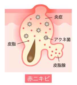 - ニキビの炎症が治まった後に残る「赤み」は、炎症による肌組織へのダメージや、毛細血管の拡張が原因で起こります。