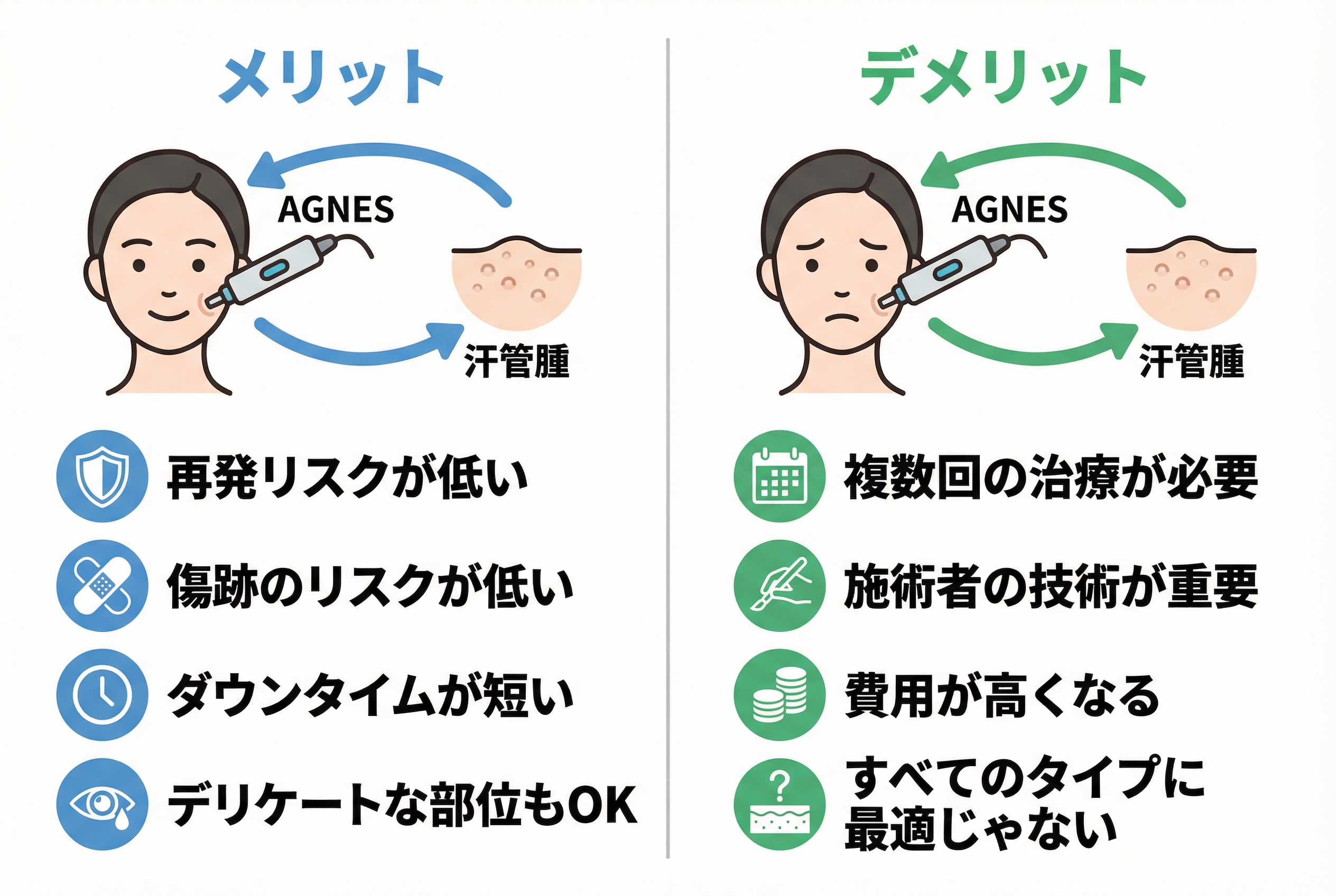 AGNESは、肌表面への影響を抑えながら病変にアプローチできる優れた治療選択肢の一つです。しかし、どんな治療にもメリットとデメリットがあります。ご自身の汗管腫の状態に本当に合っているのか、まずは専門の医師に相談し、納得のいく説明を受けることが大切です。