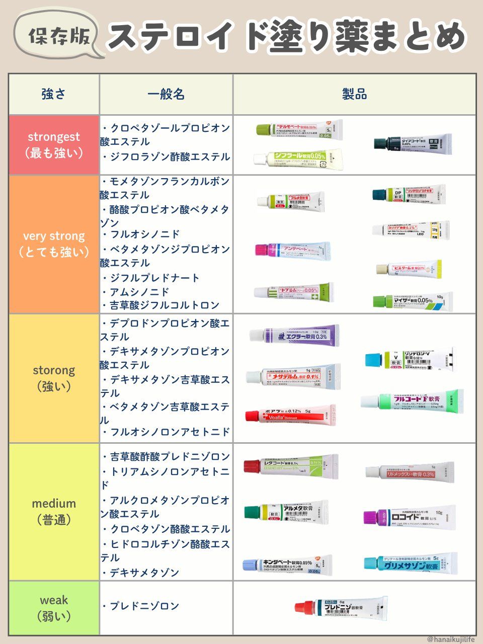 ステロイド外用薬は、その効果の強さに応じて5段階に分類されています。最も弱い「ウィーク」から、最も強い「ストロンゲスト」まで、症状や体の部位によって使い分けられます。