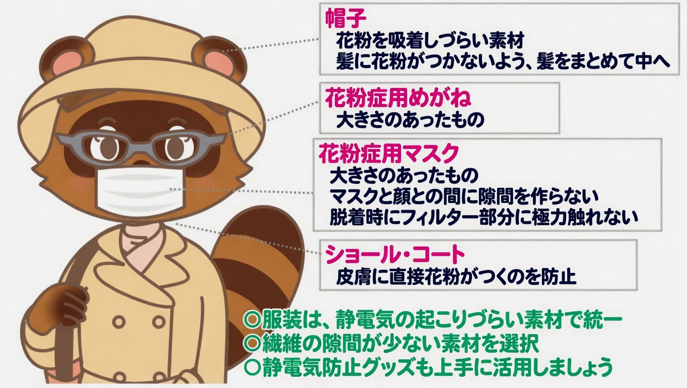 - 花粉との接触を避ける:外出時には、花粉の侵入を物理的に防ぐ花粉対策用メガネやサングラスを着用しましょう。帽子をかぶることも、髪の毛への花粉付着を減らすのに役立ちます。