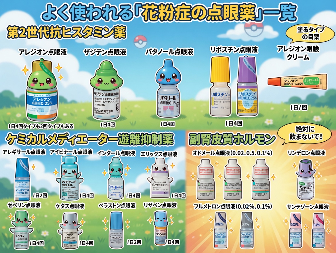 眼科で医師が処方する花粉症目薬は、市販薬よりも強力な成分を含んでいたり、市販されていない特別な作用を持つものがあります。より専門的なアプローチで、つらい症状や難治性の病態に対応します。主な種類は次のとおりです。