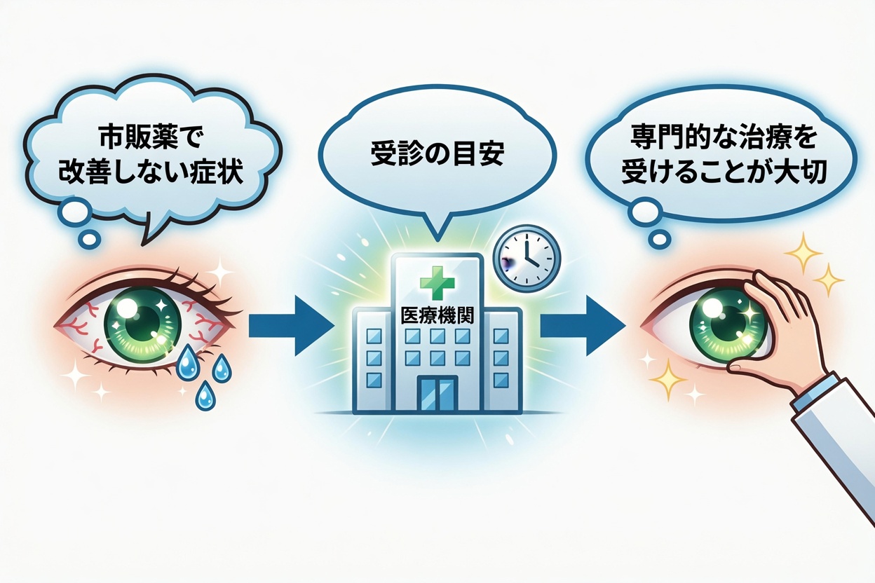- 市販薬を使い続けても症状が続く:目薬をさしても数時間でまた症状がぶり返す、あるいは点眼後も痒みや異物感が改善せず、長期間続いている場合です。