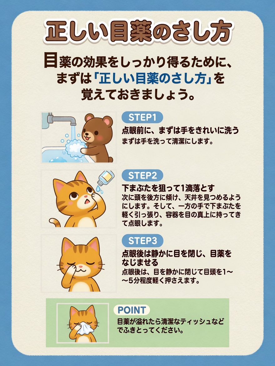 目薬の効果を十分に得るには、清潔な状態で正しく点眼することが何よりも重要です。以下の手順を参考に、焦らず丁寧に行いましょう。
