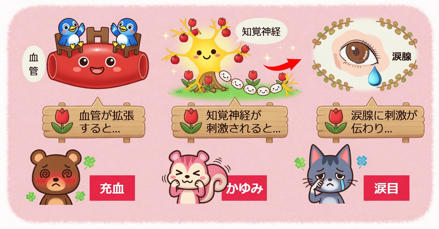 この結合が起こると、マスト細胞は大量の「ヒスタミン」をはじめとする様々なアレルギー誘発化学物質を一気に放出し始めます。ヒスタミンは、目の痒みを伝える神経を直接刺激し、血管を拡張させることで充血を引き起こします。また、涙の分泌を促進したり、目やにを増やしたりする作用もあります。