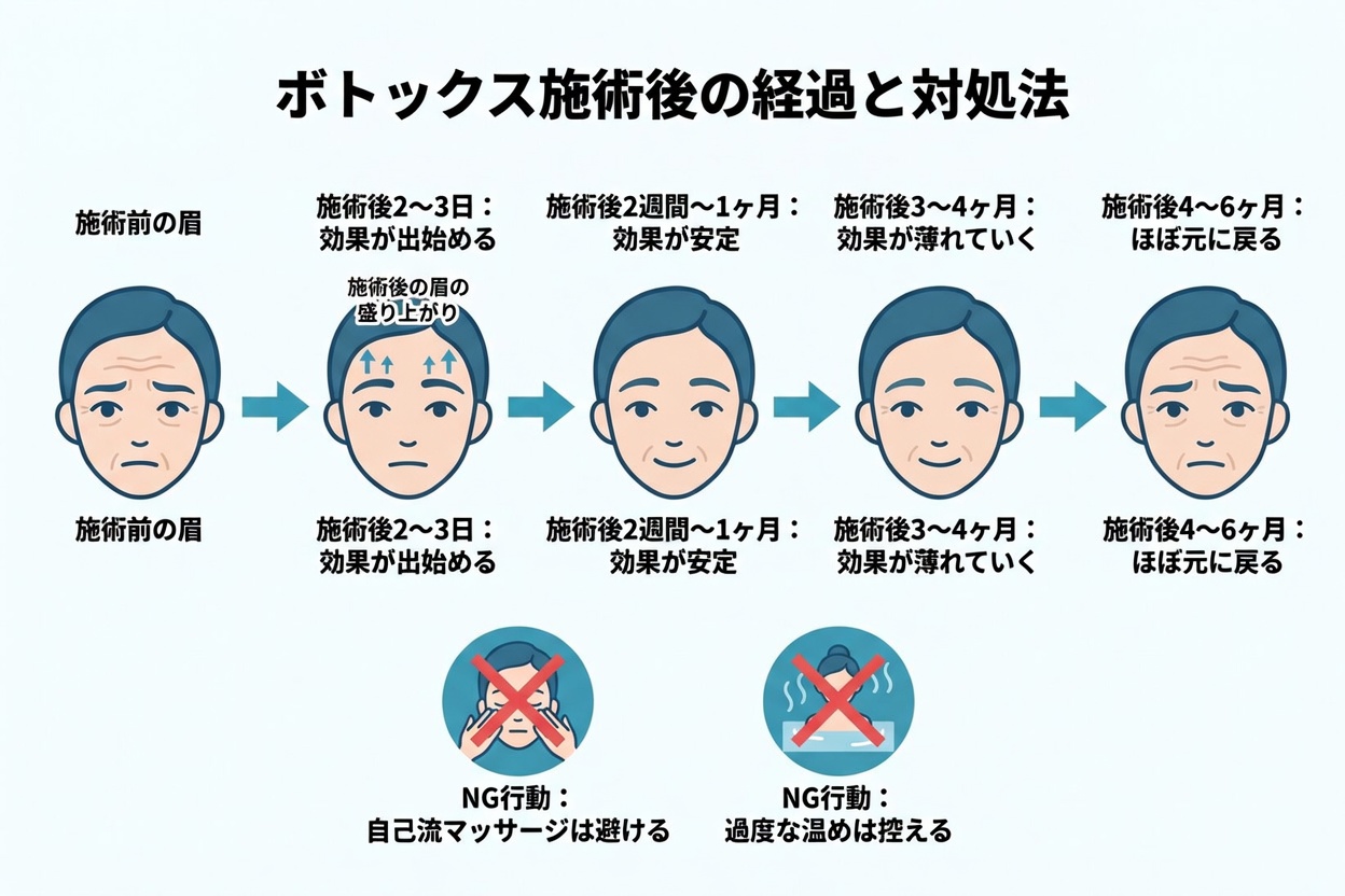 ボトックスは体内で少しずつ分解され、その効果は時間とともに薄れていきます。眉上の盛り上がりが落ち着くまでの期間も、このサイクルとほぼ同じです。